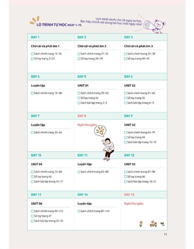 Tuần thứ hai mở rộng vốn từ vựng theo chủ đề sinh hoạt hằng ngày như trường học, công việc, sở thích và thời tiết. Đồng thời, sách cung cấp các cấu trúc ngữ pháp cơ bản, giúp học viên nắm được cách đặt câu khẳng định, phủ định, câu hỏi và câu mệnh lệnh. Lượng từ vựng tăng dần, đi kèm ví dụ minh họa thực tế, giúp người học hiểu cách sử dụng từ trong giao tiếp và nâng cao khả năng vận dụng.