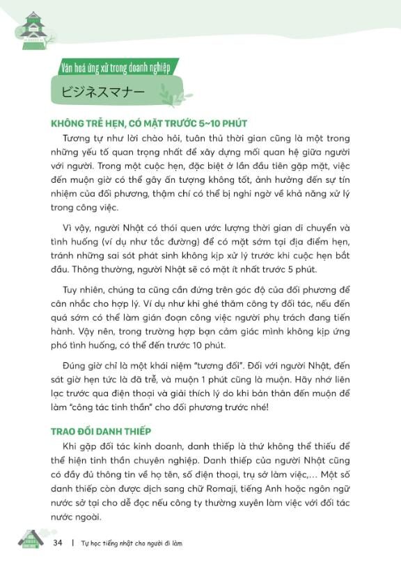 Sách Tự Học Tiếng Nhật Cho Người Đi Làm PDF là tài liệu được thiết kế đặc biệt dành cho những người đi làm muốn nâng cao khả năng sử dụng tiếng Nhật trong môi trường công việc và giao tiếp chuyên nghiệp. Cuốn sách cung cấp đầy đủ các kiến thức nền tảng về ngữ pháp, từ vựng chuyên ngành, kỹ năng viết email, thuyết trình, họp hành, gọi điện thoại và các tình huống giao tiếp thực tế khác. Đồng thời, sách hướng dẫn cách phát âm chuẩn, sử dụng từ ngữ phù hợp và nhấn nhá ngữ điệu trong từng bối cảnh, giúp người học phát triển phản xạ tự nhiên và tự tin hơn khi giao tiếp.